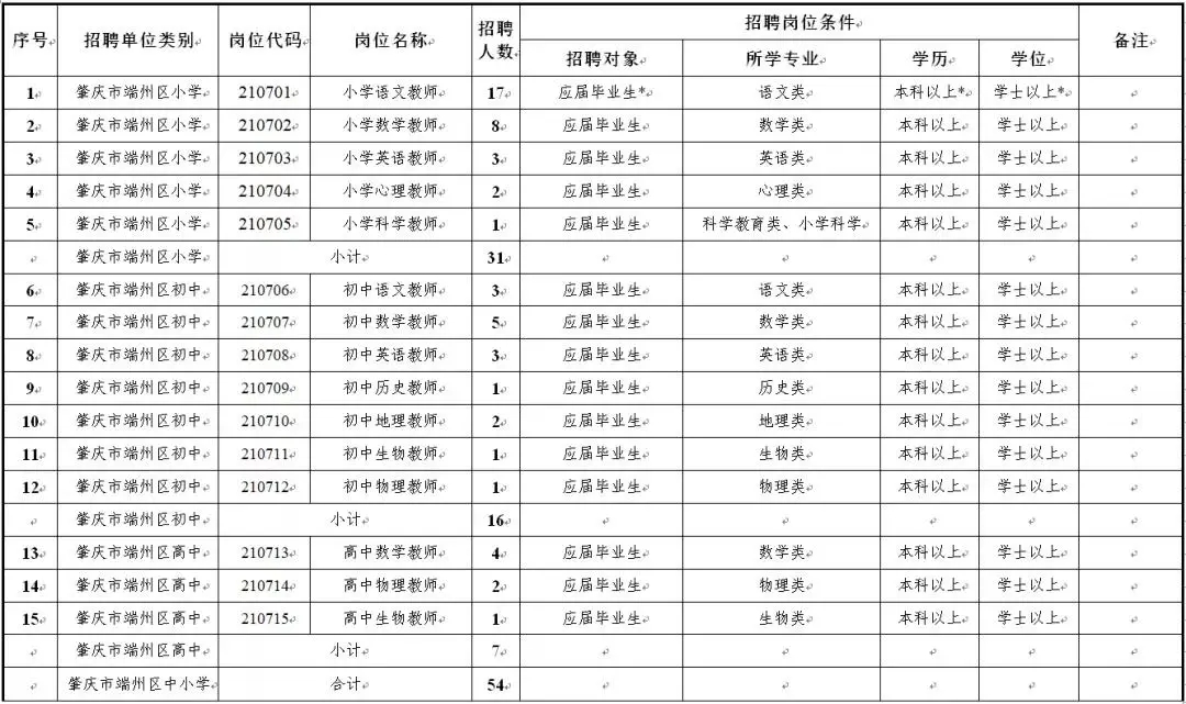本次中小學(xué)教職員招聘人數(shù)為54人,具體崗位見公告附件1“肇慶市端州區(qū)教育局2021年第四批高校招聘中小學(xué)教職員崗位信息表”。