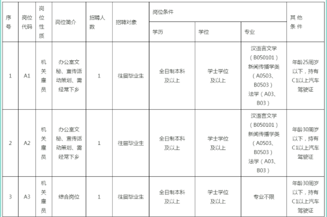 (三)招聘對(duì)象:招聘對(duì)象為全日制普通高等學(xué)校往屆畢業(yè)生,年齡不超30周歲。往屆畢業(yè)生指2019年9月30日前取得畢業(yè)證書(shū)、學(xué)位證書(shū)的全日制普通高等院校畢業(yè)生。報(bào)考人員必須于報(bào)名之日前取得招聘崗位須提供的相應(yīng)畢業(yè)證、學(xué)位證書(shū)等。