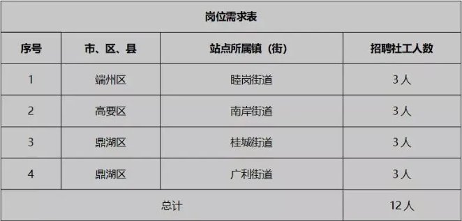 本次招聘的社工崗位涉及3個(gè)縣市區(qū),4個(gè)鎮(zhèn)(街)社工站,共需招聘12名社工,具體崗位情況如下: